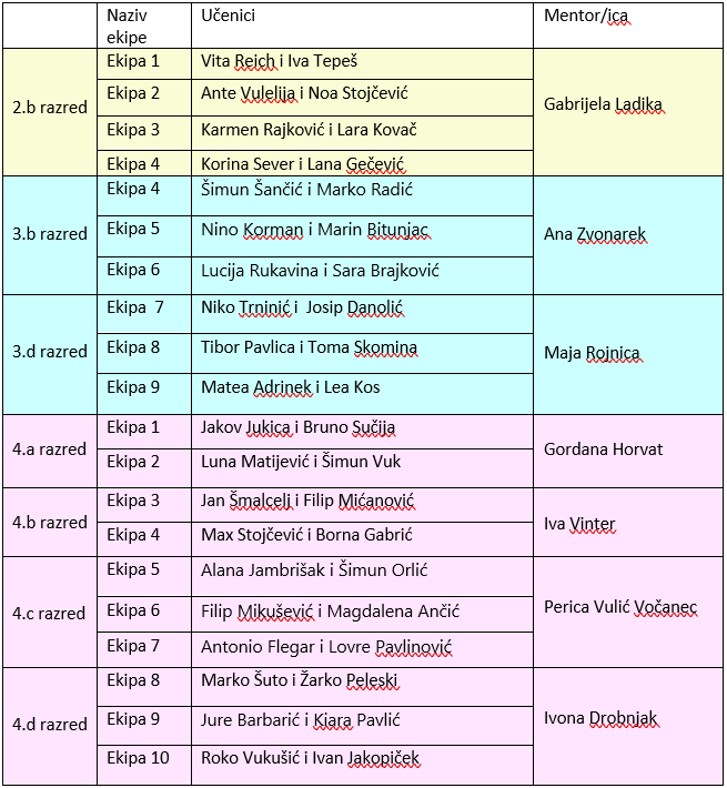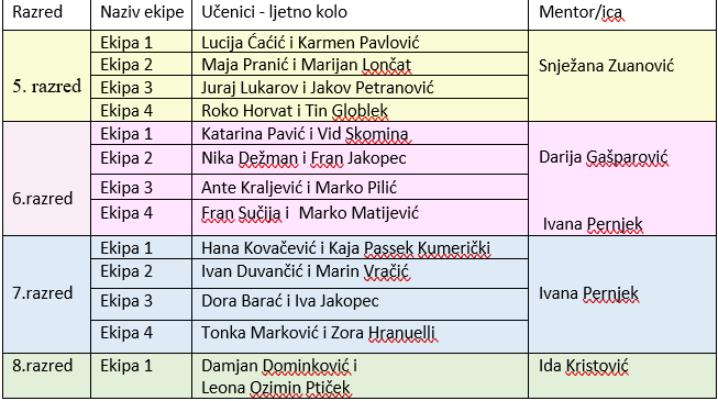U tablici je popis učenika po ekipama, a njihovi rezultati se mogu vidjeti na poveznici: