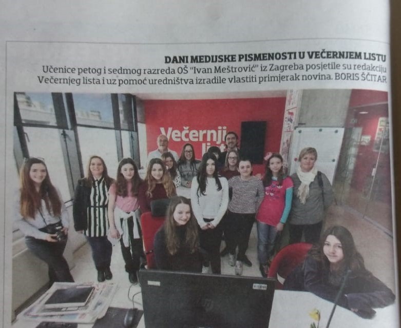 U sklopu Dana medijske pismenosti naša škola prijavila se na radionicu „Djeca upoznaju medije“ i posjetila Večernji list 12. ožujka 2019. Grupa učenica petoga i sedmoga razreda razgledala je redakciju Večernjeg lista, studio u kojem se snimaju prilozi te sudjelovala na glavnom uredničkom kolegiju.